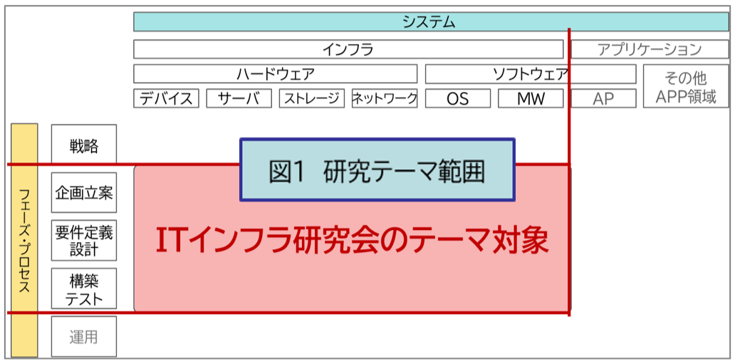 本研究会では、右の図1に示すITインフラのテーマ範囲について研究を行います。
